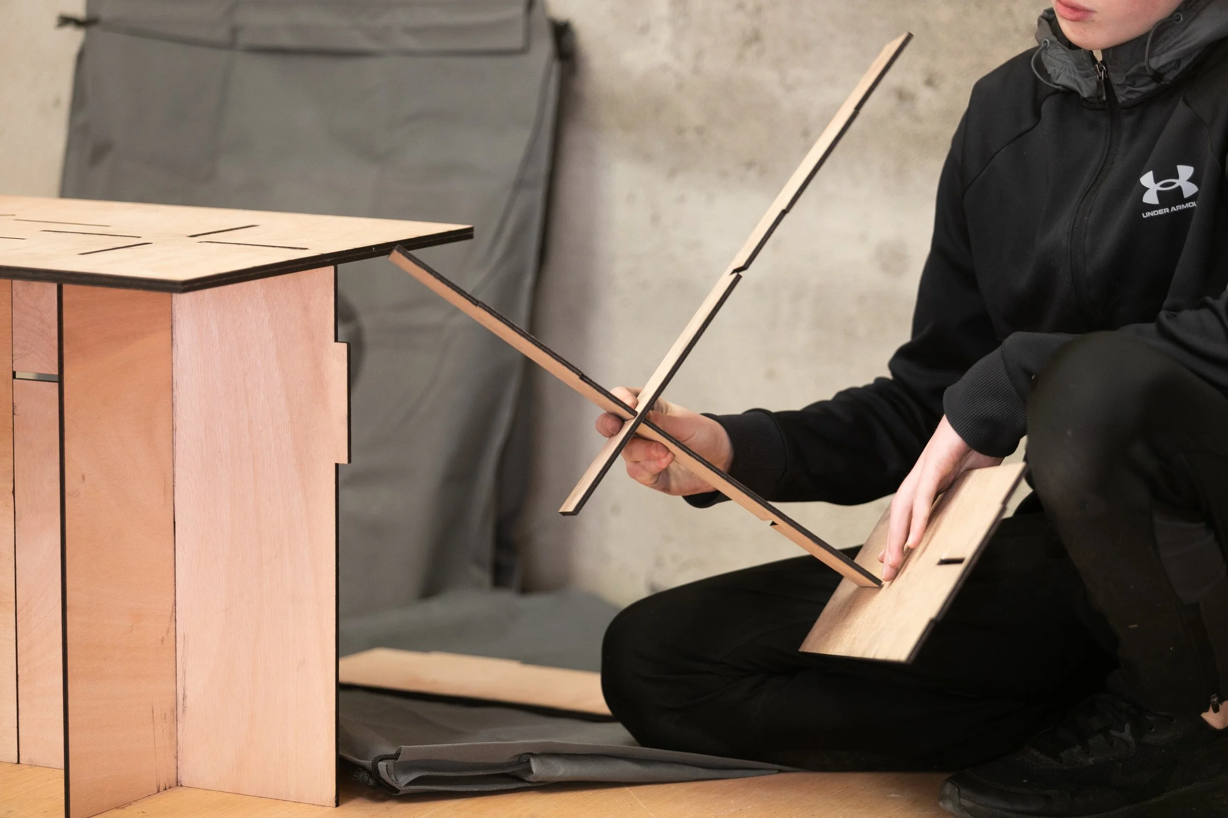Sheets of plywood were laser cut into a kit-of-parts with mortice-and-tenon joints as well as finger joints strategically pre-cut to allow for a range of configurations.